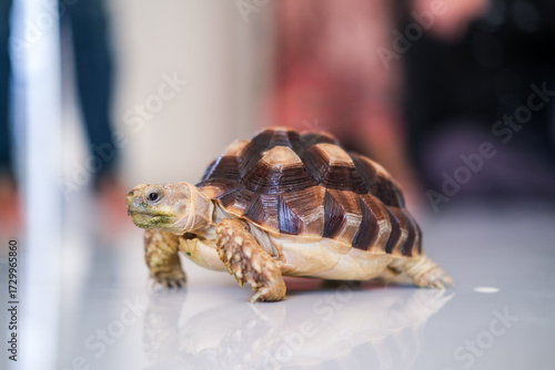 © Fani, Obraz premium Small tortoise walking slowly on a smooth reflective surface indoors, its patterned shell catching the light while its curious face looks ahead with calm and steady movement.