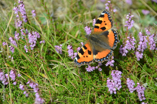 © Kim, Obraz premium Small tortoiseshell butterfly sits in blooming heather.