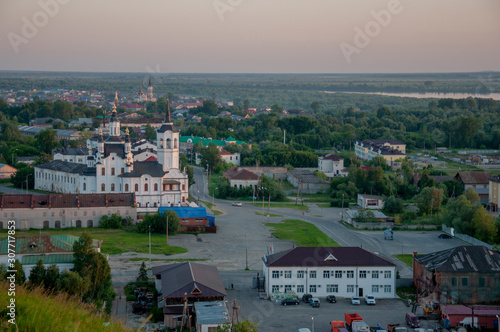 © Oksana, Fototapeta premium Small town with tiny houses near the river and green forests and fields. Trees and their shadows on the grass. Sundown and sunrises. View from high on the landscape