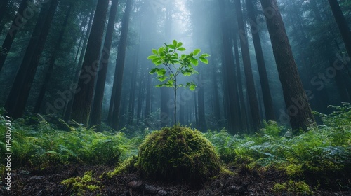 Obraz premium Small tree growing in a misty forest.