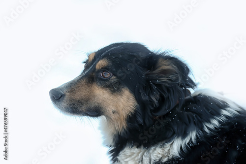 Fototapeta premium small tricolor mongrel dog in the snow