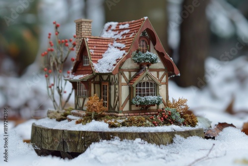 Fototapeta premium Small tudor style cottage model sitting on a tree stump covered in snow in a...