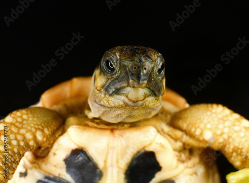 © Иван Грушевич, Naklejka premium Small turtle close up on black background, for animal protection and environmental research project