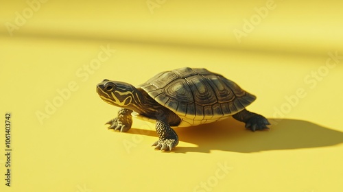 © VisualVortex, Obraz premium Small Turtle Crawling on Yellow Background