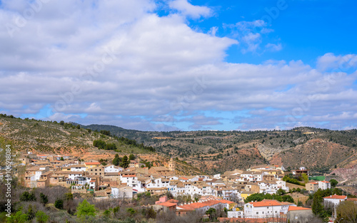 Fototapeta premium Small village in the valley of Cofrentes and banks of the river Cabriel (Zarra).