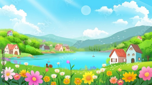 Fototapeta premium Small village with flowers by the beautiful lake, vector illustration style