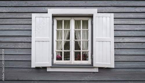 © Emily, Fototapeta premium small vintage white window with shutters on wooden grey wall