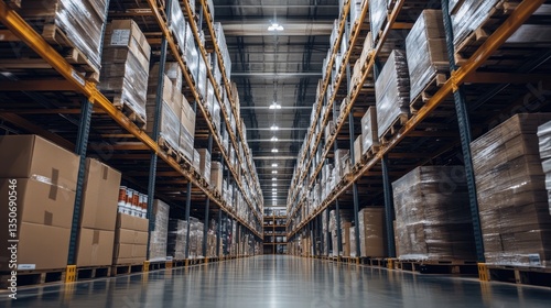 Fototapeta premium Small warehouse space with organized shelves filled with neatly labeled...
