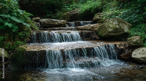 © Crafted, Fototapeta premium Small waterfall flowing over rocks in a lush green forest.