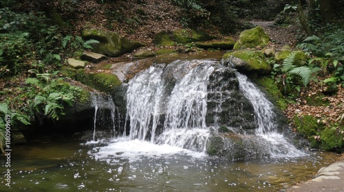 Fototapeta premium Small waterfall flows into pond, forest backdrop, for nature, calm, or...