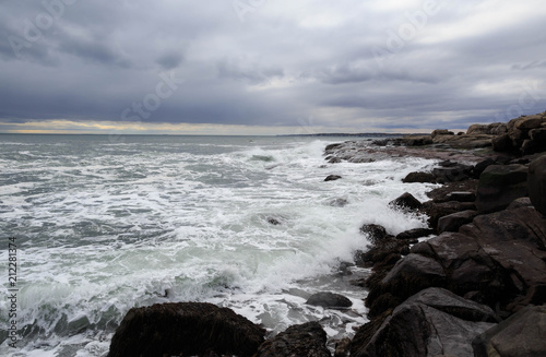Obraz premium Small waves crash against rocky shore under dramatic storm clouds