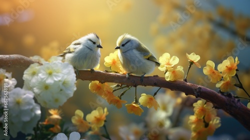 © Tirawat, Obraz premium Small white birds perched on a stick amid flowers in the exotic style.