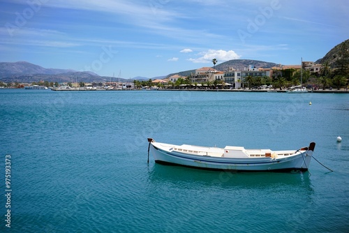 © Thomas, Naklejka premium small white boat anchored in a bay with turquoise blue water in nafplio in greece on a sunny summer day