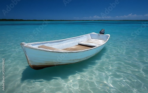 Naklejka premium Small white boat floats in tranquil turquoise water.