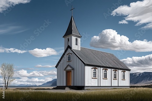 © Javid, Fototapeta premium Small White Church in the Countryside. AI generated image