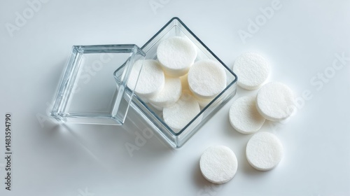 © Nurul, Fototapeta premium Small white circular candies in a clear plastic box
