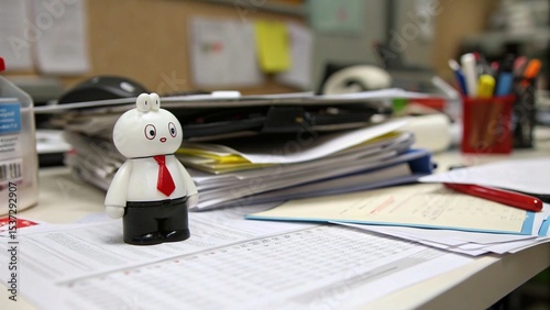 © Afaq, Obraz premium Small White Figurine Stands Amidst a Cluttered Office Workspace, Symbolizing Overwhelm and Workplace Chaos
