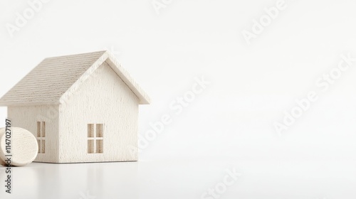 © PAPAHJAHATZ, Fototapeta premium Small white house model with round objects on white background.