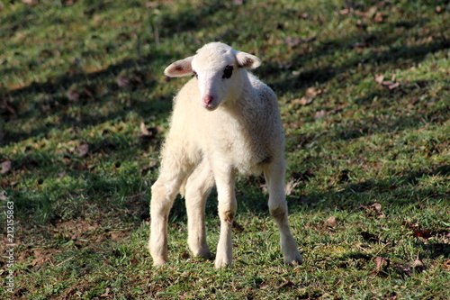 © hecos, Obraz premium Small white lamb with black eye patches standing on uncut green grass and posing for camera