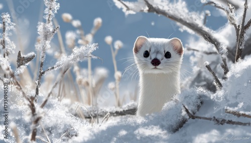 © Howl, Fototapeta premium Small white mammal peeks out from behind snow covered winter brush