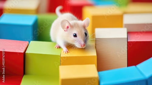© Artyom, Fototapeta premium Small white mouse on colorful building blocks