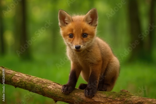 © NeuralNiche, Fototapeta premium Small wild fox in its natural environment, perched on a tree branch