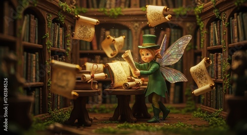 Naklejka premium Small winged figure in green attire examines scrolls in a mystical library.