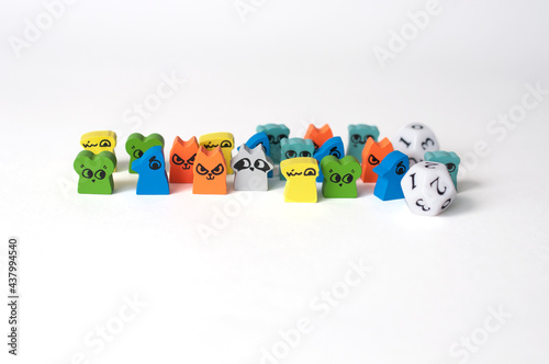 © TATSIANA, Obraz premium Small, wooden animal figurines for a board game on a white background.