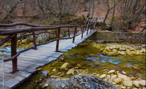 © Yuriy Kulik, Fototapeta premium small wooden bridge across mountain river