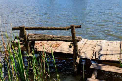 Fototapeta premium Small wooden pier with bench for fishing on a lake