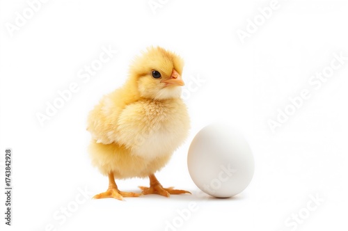 © AkuAku, Fototapeta premium Small yellow chick and egg on a white backdrop