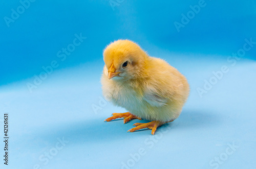 Obraz premium Small yellow chick on a blue background.