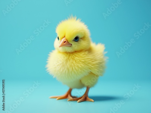 Fototapeta premium Small yellow chick standing on blue background