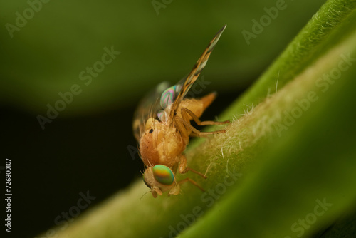 © DiazAragon, Naklejka premium Small yellow fly perched on a green leaf.