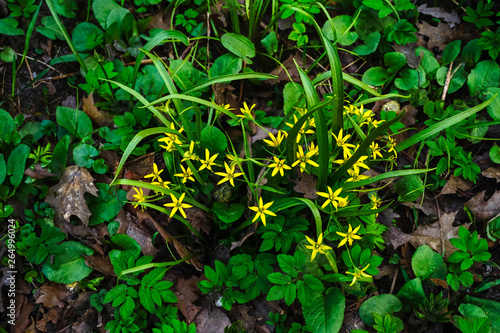 © Olga, Fototapeta premium small yellow spring flowers and greens