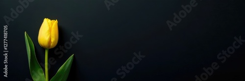 © Sathaporn Buarabut, Naklejka premium Small yellow tulip bud with green stem on a somber black canvas, small, bud