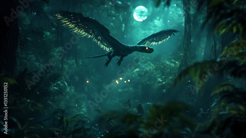Naklejka premium Small yet deadly Microraptor gliding through the dense jungle its feathered wings shimmering under the moonlight The prehistoric night is alive with sounds as glowing eyes peer from the shadows