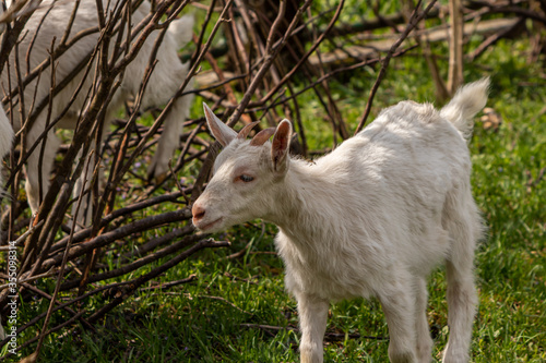 Fototapeta premium Small young goat next to bush