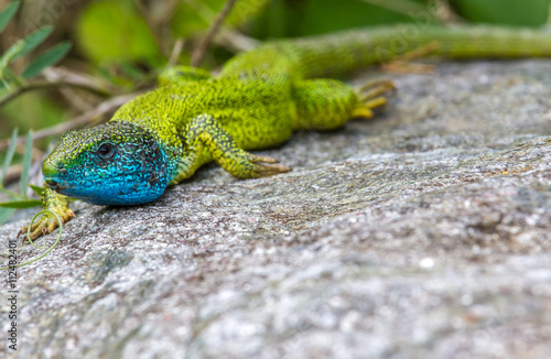 © Jamrooferpix, Fototapeta premium Smaragdeidechse sonnt sich auf Stein