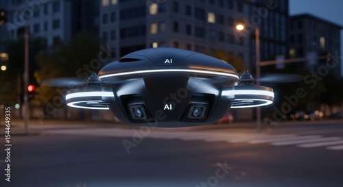 © ferifadli, Fototapeta premium Smart AI Surveillance Pod Floating Above City Street
