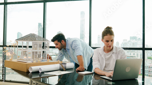Obraz premium Smart architect engineer inspect house model while colleague using laptop analysis data. Professional designer team working together to design house model construction at modern office. Tracery