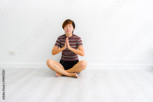 © nuiiko, Fototapeta premium Smart Asian woman meditating indoors at home.
