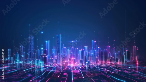 © Wahyu, Fototapeta premium Smart city and abstract dot point connect with gradient line and aesthetic Intricate wave line design , big data connection technology concept . 3d render AI generated