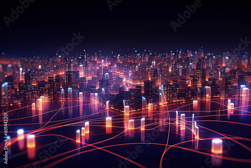 Naklejka premium Smart city and abstract line and dot connect with gradient line design. AI technology generated image