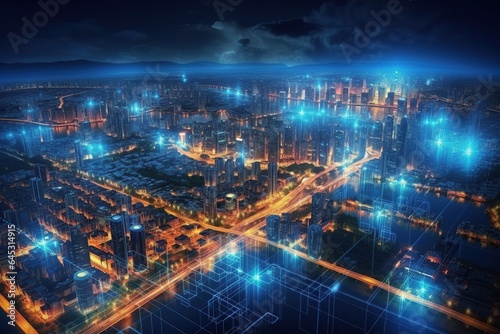 © Vilaysack, Fototapeta premium Smart city and big data connection technology, abstract line connection on night city background, communication network concept, Data storage, service, online, financial, Connectivity global