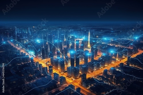 © Vilaysack, Fototapeta premium Smart city and big data connection technology, abstract line connection on night city background, communication network concept, Data storage, service, online, financial, Connectivity global