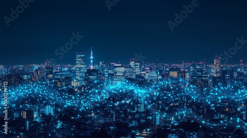 © Aziz, Fototapeta premium Smart city and big data connection technology concept with digital blue wavy wires with antennas on night megapolis city skyline background, double exposure
