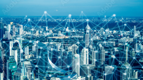 © Apichet, Obraz premium Smart city and network communication. And data transformation on public.