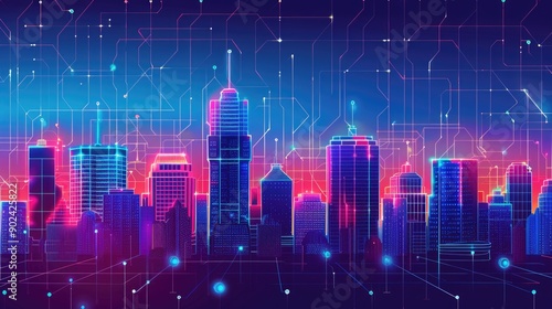 © Achmad Khoeron, Fototapeta premium smart city at night, application development concept, smart city, Internet of things, smart life, information technology, gradient grid line