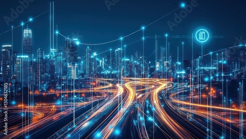 Fototapeta premium Smart city at night with digital network overlay.